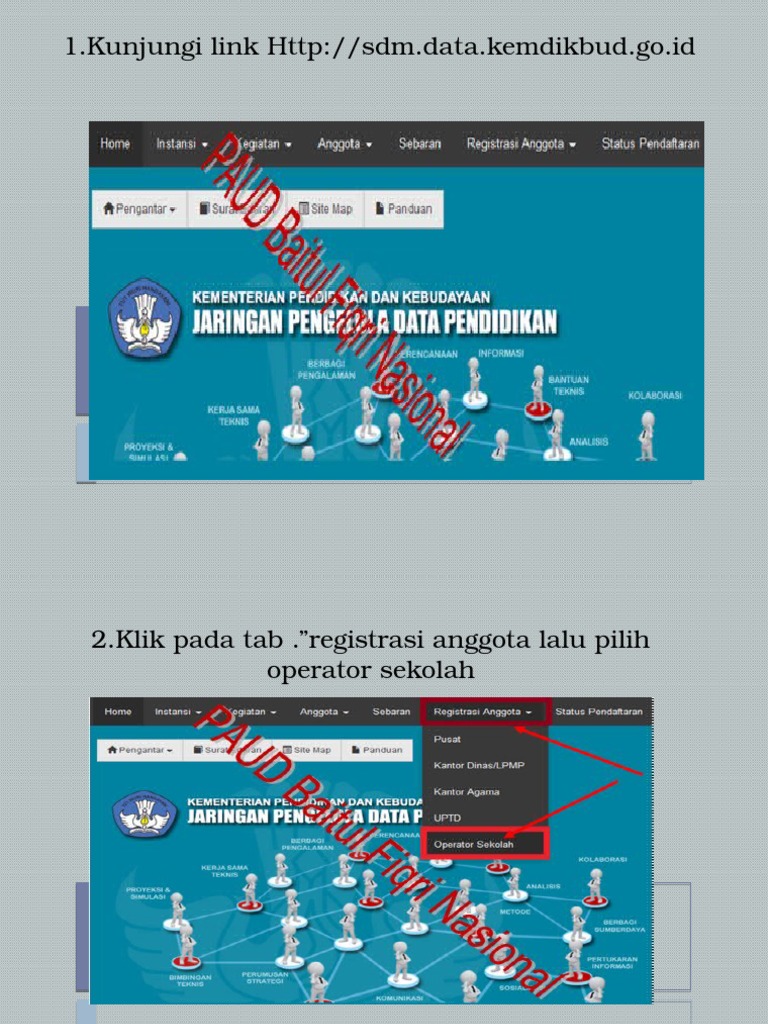 Sdm Pdspk from sdm.data.kemdikbud.go.id Operator sekolah dan operator dinas pendidikan kab/kota yang sudah terdaftar di www.sdm.data.kemdikbud.go.id tidak perlu melakukan registrasi ulang agar dapat melakukan operasional vervalgtk, namun bila oleh pimpinan ditunjuk operator yang lain untuk operasional vervalgtk maka operator yang ditunjuk harus registrasi baru dengan melampirkan sk. Pertama kita harus pahami dulu kenapa kita harus daftar di kemdikbud? Gedung c lantai 1 kompleks kemdikbud senayan jakarta, 10270 call center : Surat edaran penerimaan peserta didik baru tahun 2020/2021. 1mb (ditandatangani kepsek dan cap), setelah registrasi silahkan cek di. Setiap guru dan tenaga kependidikan harus melampirkan foto pada vervalptk, dan untuk memperbaiki data melalui vervalptk unit layanan terpadu : //sdm.data.kemdikbud.go.id/ dalam wujud pdf, kamu dapat scan dahulu sk nya. Kedua, klik pada menu registrasi anggota > kemudian pilih operator sekolah (lihat gambar) ketiga, silahkan masukkan data diri anda dan diakhir kita harus melampirkan sk operator sekolah dalam format pdf, baca :